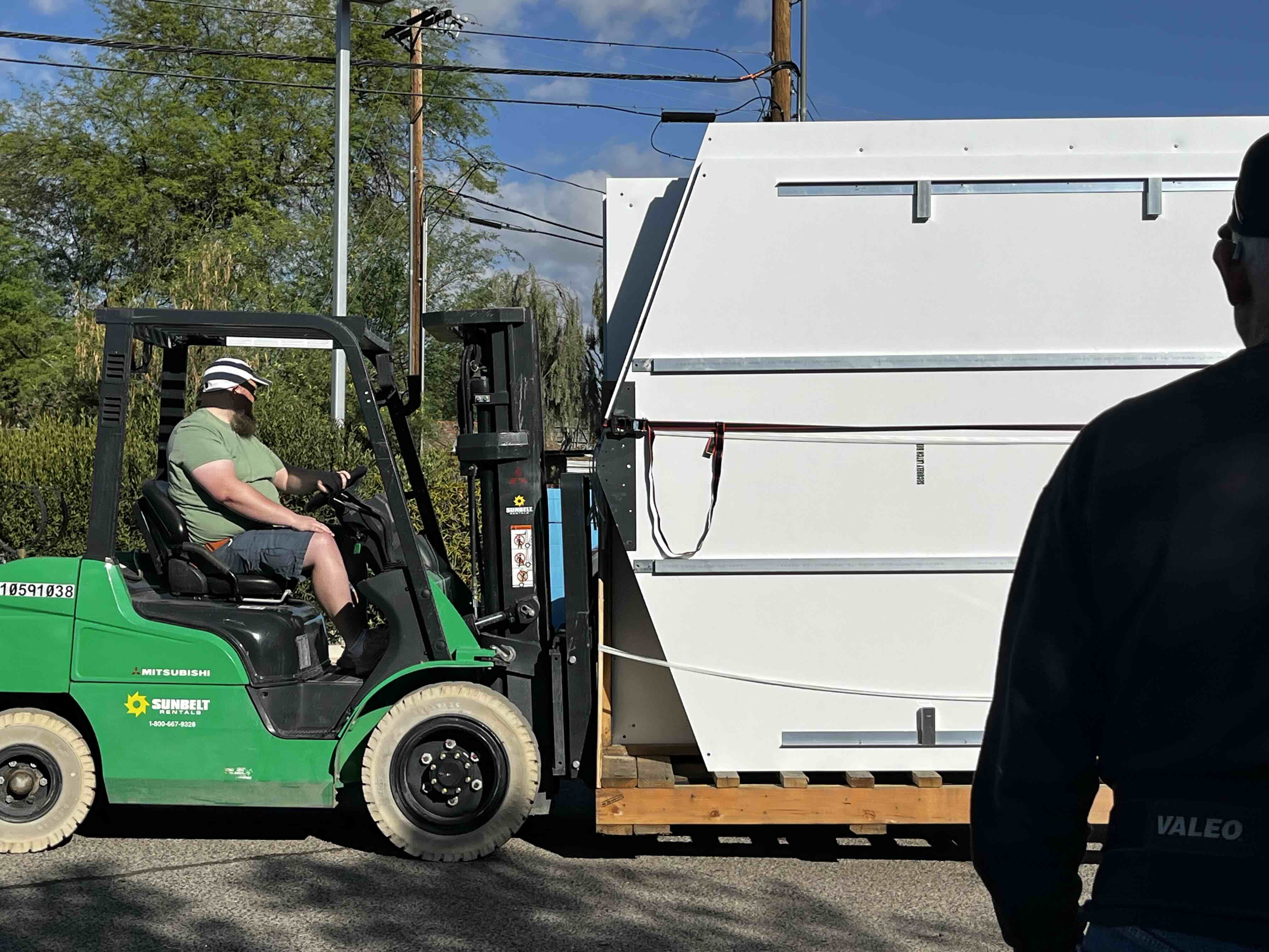 Rigel Grigsby used one forklift to load the Pallet micro-shelter flat-packs onto a truck which was then driven by Jim Gregory to the village site where Rigel used another forklift to unload the truck. | | | | Volunteers sorted through the pieces, arranged the shelter components on the prepared gravel pads, and then bolted and screwed the shelters together. | |
