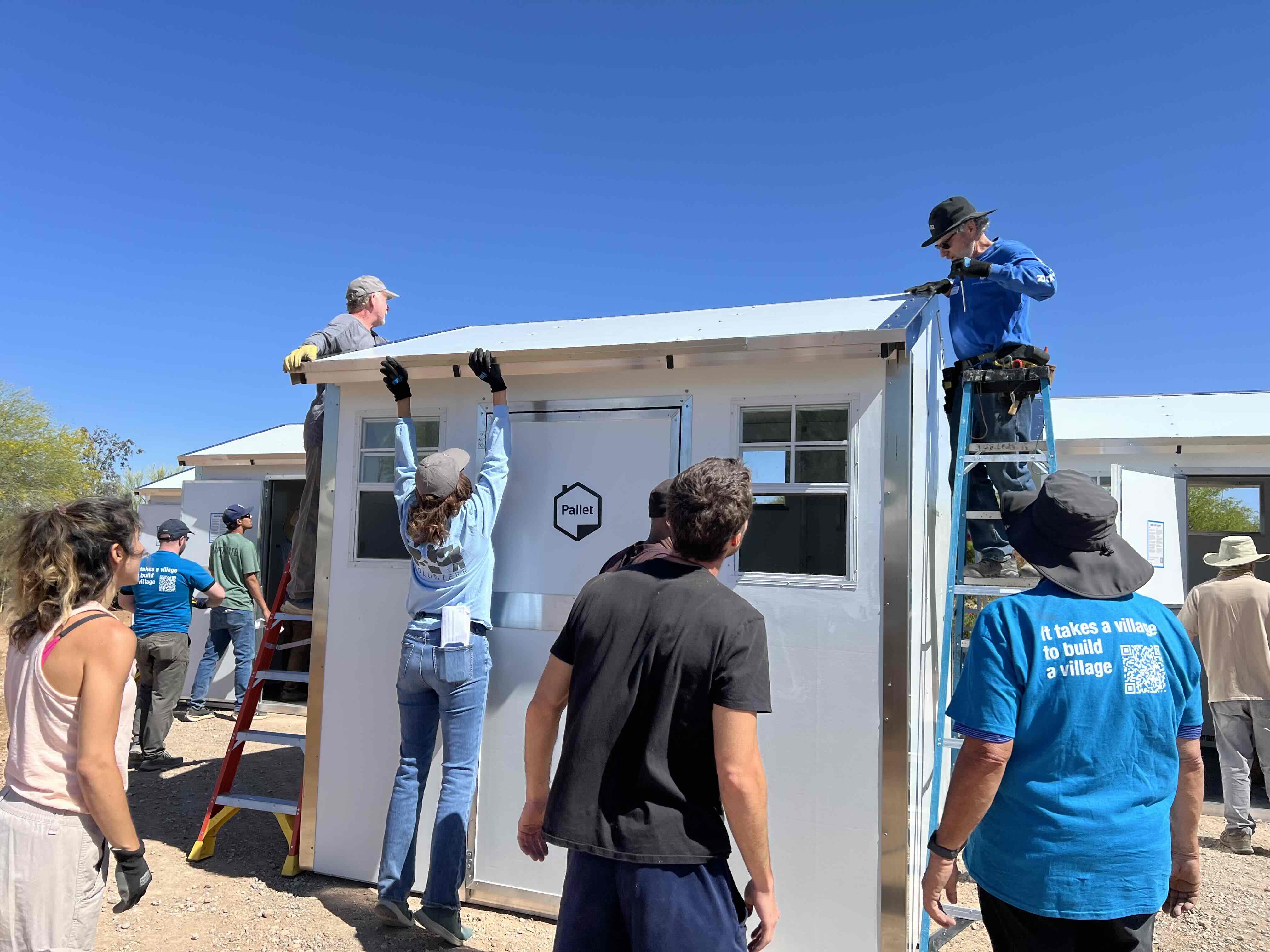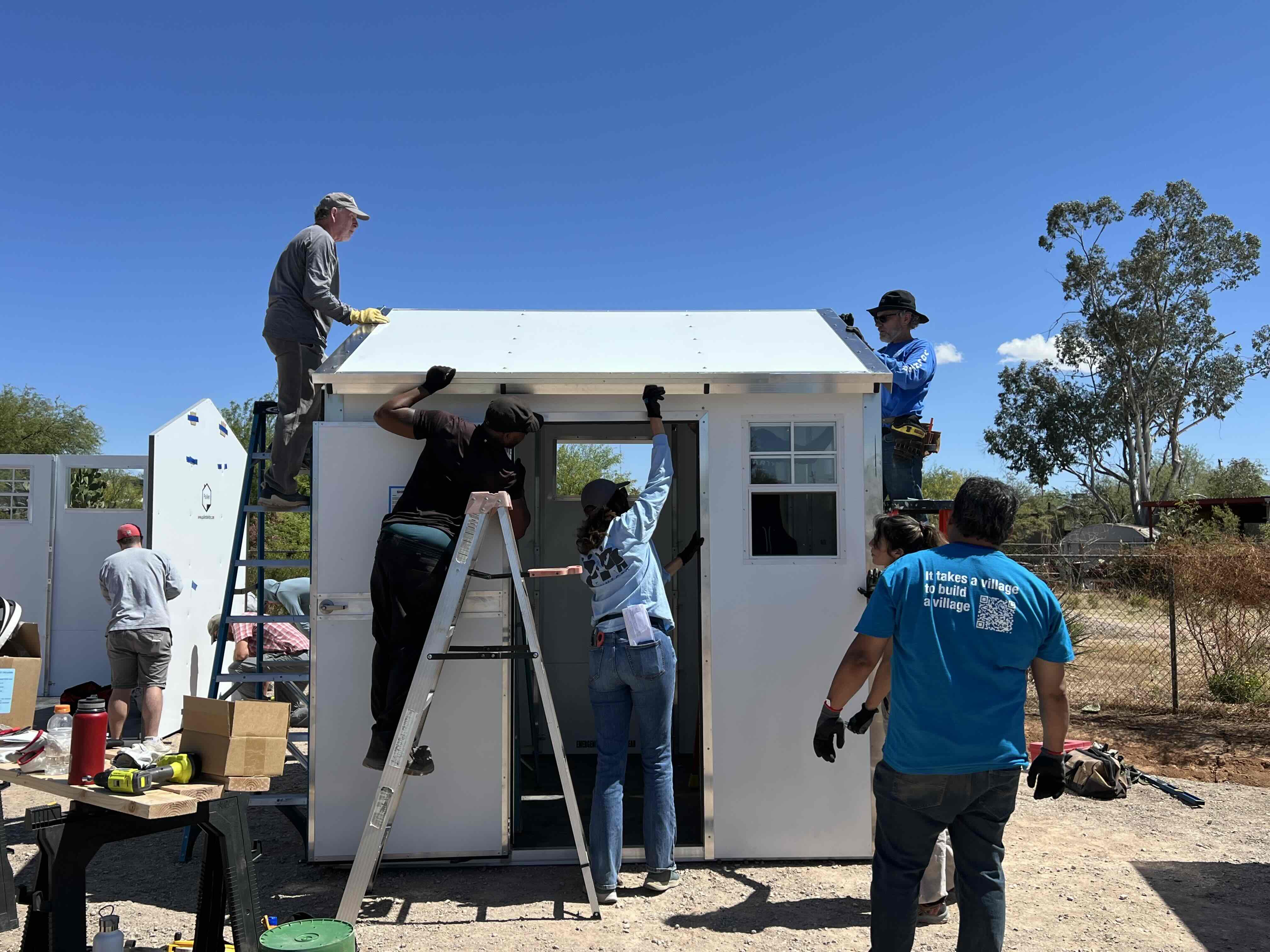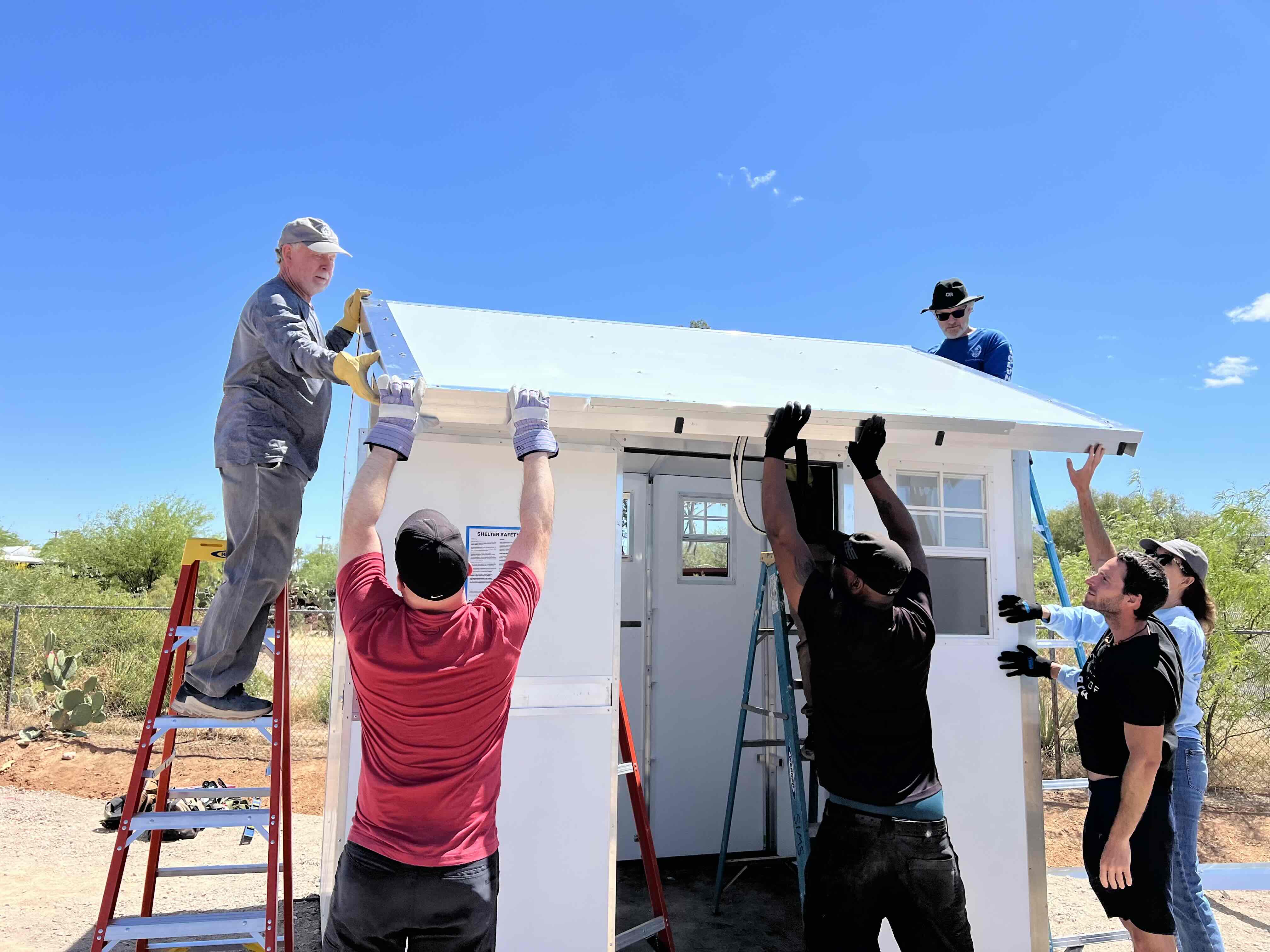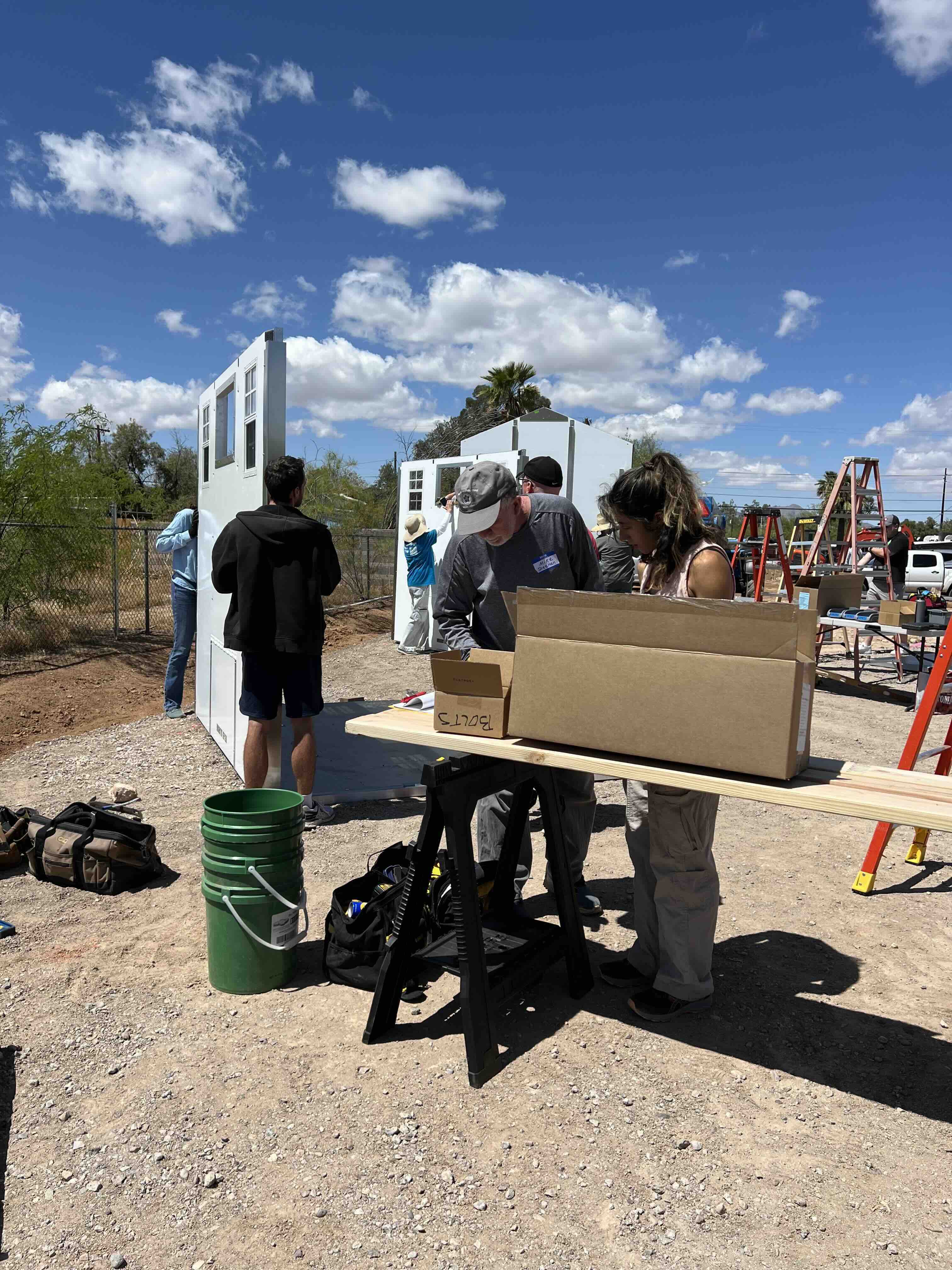 The Micro-shelters for THP's first village have been installed! Thanks to nearly fifty very dedicated volunteers led by six very skilled volunteer team leaders, the prefabricated Pallet (brand) micro-shelters were assembled at our first village site, a small 0.8 acre property on which the owner--Southern Arizona Land Trust (SALT)--has given us a free four-year lease. SALT even pays the property tax. It all began with the site clean-up when, for a week, volunteers showed up daily with their chainsaws, pruners, rakes, gloves, and sunscreen to remove the trash, dead vegetation, a discarded sofa, and -- unfortunately but unavoidably -- some beautiful old mesquites and cacti. Then Dino Rendon of Mr. Tree tree service, donated nearly an entire Saturday to removing tree stumps using a Mr. Tree back hoe. Four roll-aways were taken off to Tank's for composting and a stack of free mesquite firewood was left for neighbors. Then, on Saturday April 19th, volunteer Rigel Grigsby took his first forklift-full of the towering flat-packs out of storage and loaded it onto a rented 26-foot flatbed truck. Once the flatbed was loaded, volunteer Jim Gregory drove it slowly to the village site, where Rigel unloaded it using a mammoth all-terrain forklift. Then the team leaders carefully unpacked the floors and put each where survey stakes indicated a shelter should be. After the floors had been leveled, and Rigel and Jim had unloaded the last pallet of flat packs, team leaders with their teams of six to eight volunteers spent the next few hours assembling the shelters, lining up screw holes, driving screws, and inserting and fastening bolts with nuts, finishing with wrestling the roof components up to teammates perched on ladders, to be attached. In assembling these fifteen micro-shelters, the volunteers effectively donated $7,500 to THP; that's the cost of two professional assemblers being sent from Pallet’s factory in Everett, WA. Yolanda Sethi, Board Member and Head of THP's Volunteer Program, and Julie Gunther, Chair of THP Resource Committee, organized this Herculean effort. Volunteer, and candidate for Congress, Chris Donat provided 6 dozen donuts that eventually disappeared. And when lunch time came, Slice and Ice subs provided by Julie Gunther were much appreciated. The shelters have been assembled considerably ahead of the usual construction schedule where utility infrastructure is usually completed first. But since the units have no plumbing and their electrical connections are minimal, the usual order was reversed. After a day of putting the shelters up, the village site looks pretty much like a group of plain white shacks huddled on a denuded property. Thank goodness that Pima County gave us an Extreme Heat Relief grant to plant large trees as soon as possible. In the fifteen micro-shelters now on site, only ten people can be housed due to zoning restrictions related to the property size and location near substance dependence treatment facilities. Already, since our setting up the shelters, we have had several people stop by to find out how they could apply for residence. THP will not itself be taking applications, on site or otherwise; instead, we will qualify potential residents through use of the City's Homeless Management Information System. People who are interested should be advised to contact the City for services, by calling 211, or to contact the City through any social service agency, such as Old Pueblo Community Services, La Frontera, Primavera Foundation, etc.