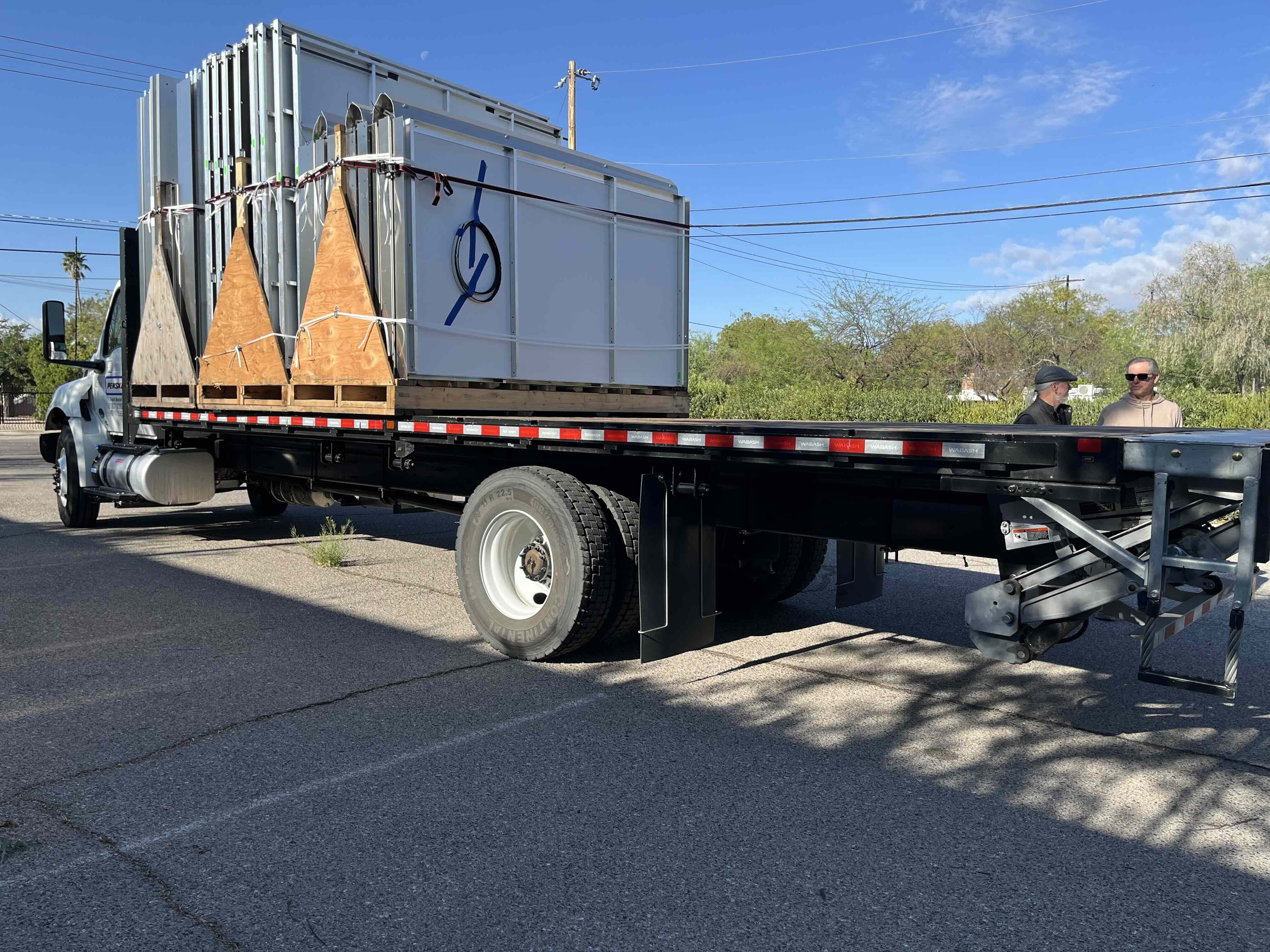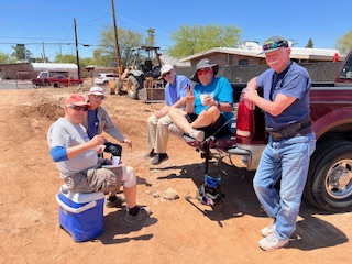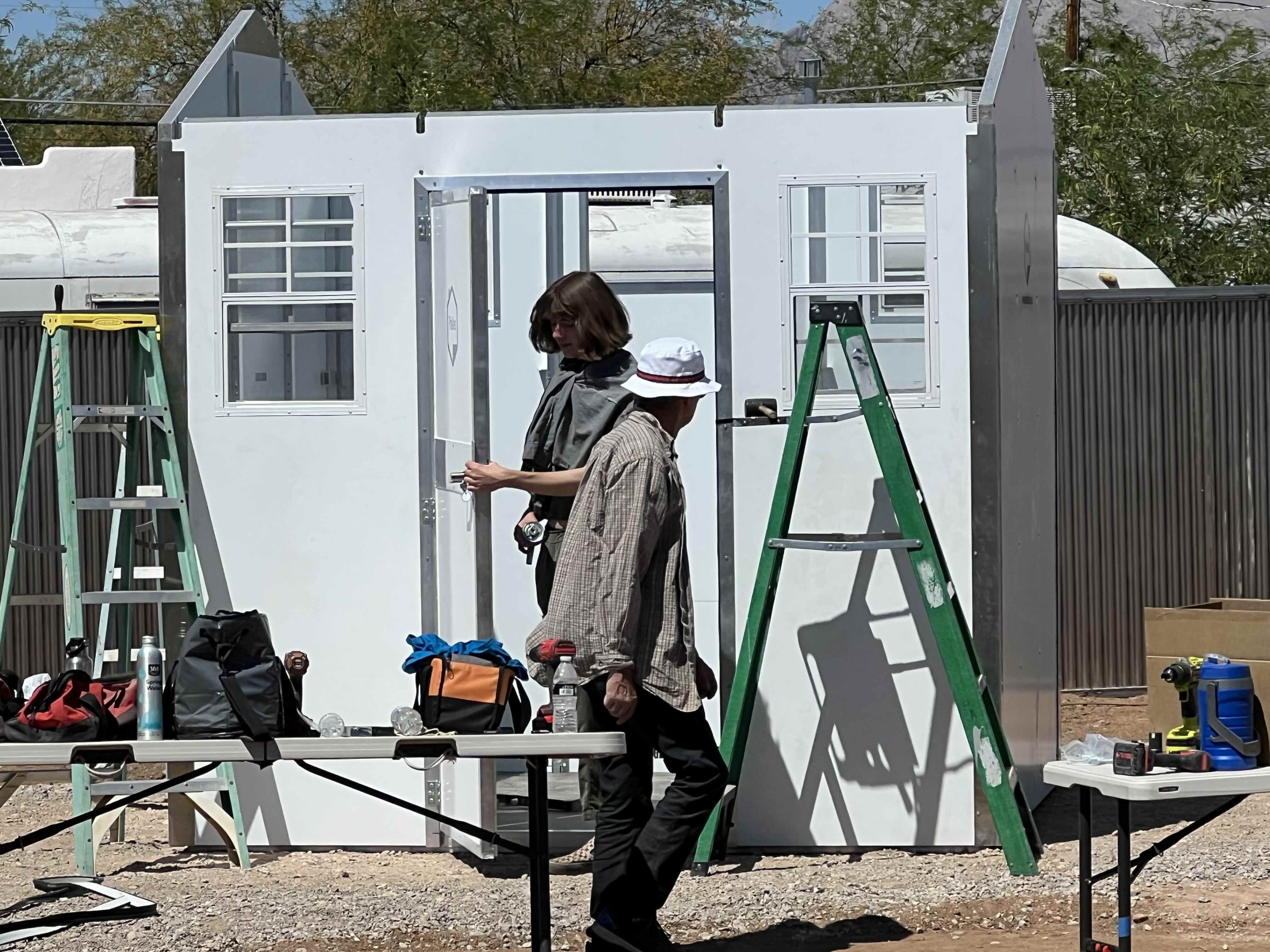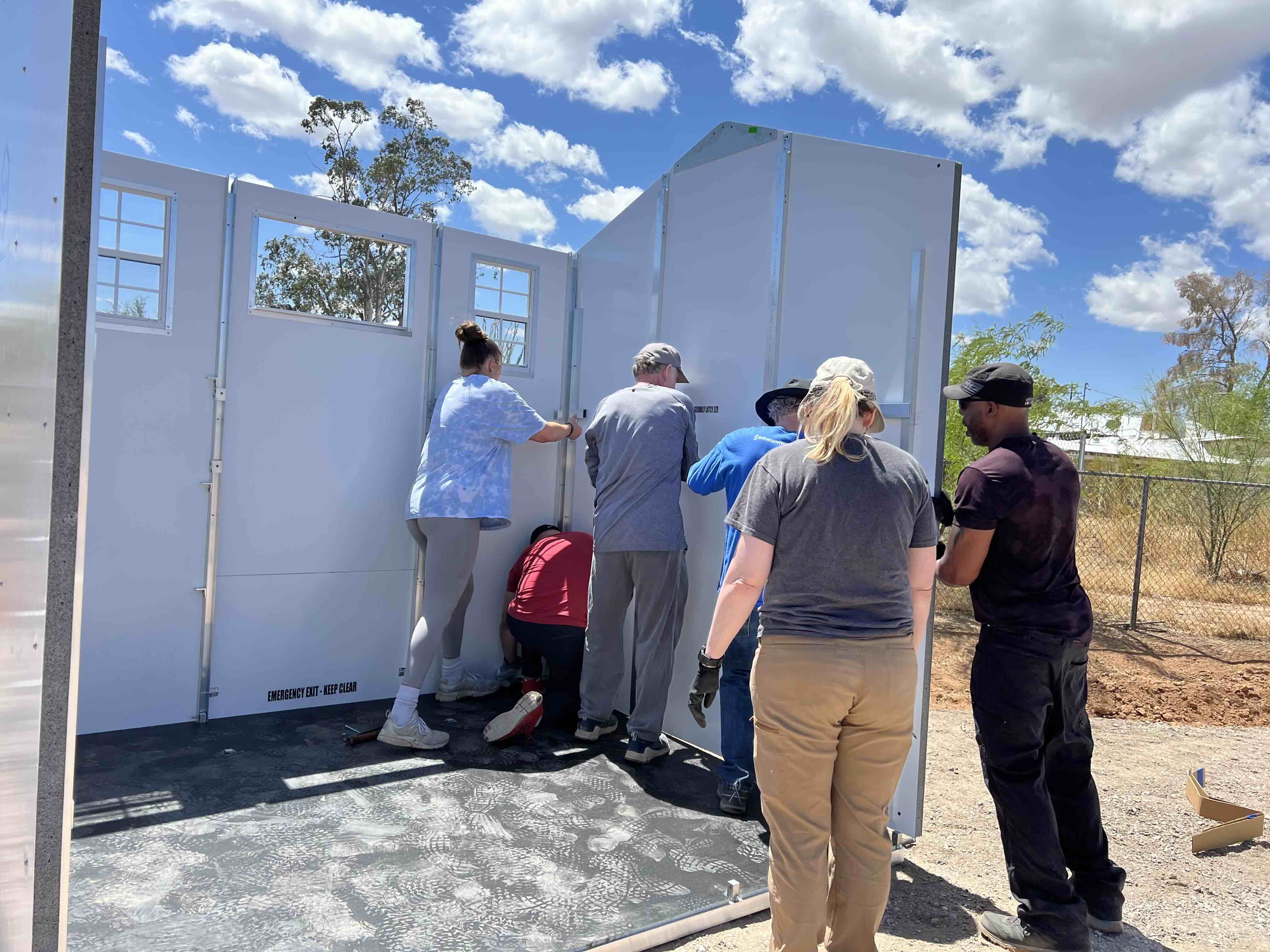 The Micro-shelters for THP's first village have been installed! Thanks to nearly fifty very dedicated volunteers led by six very skilled volunteer team leaders, the prefabricated Pallet (brand) micro-shelters were assembled at our first village site, a small 0.8 acre property on which the owner--Southern Arizona Land Trust (SALT)--has given us a free four-year lease. SALT even pays the property tax. It all began with the site clean-up when, for a week, volunteers showed up daily with their chainsaws, pruners, rakes, gloves, and sunscreen to remove the trash, dead vegetation, a discarded sofa, and -- unfortunately but unavoidably -- some beautiful old mesquites and cacti. Then Dino Rendon of Mr. Tree tree service, donated nearly an entire Saturday to removing tree stumps using a Mr. Tree back hoe. Four roll-aways were taken off to Tank's for composting and a stack of free mesquite firewood was left for neighbors. Then, on Saturday April 19th, volunteer Rigel Grigsby took his first forklift-full of the towering flat-packs out of storage and loaded it onto a rented 26-foot flatbed truck. Once the flatbed was loaded, volunteer Jim Gregory drove it slowly to the village site, where Rigel unloaded it using a mammoth all-terrain forklift. Then the team leaders carefully unpacked the floors and put each where survey stakes indicated a shelter should be. After the floors had been leveled, and Rigel and Jim had unloaded the last pallet of flat packs, team leaders with their teams of six to eight volunteers spent the next few hours assembling the shelters, lining up screw holes, driving screws, and inserting and fastening bolts with nuts, finishing with wrestling the roof components up to teammates perched on ladders, to be attached. In assembling these fifteen micro-shelters, the volunteers effectively donated $7,500 to THP; that's the cost of two professional assemblers being sent from Pallet’s factory in Everett, WA. Yolanda Sethi, Board Member and Head of THP's Volunteer Program, and Julie Gunther, Chair of THP Resource Committee, organized this Herculean effort. Volunteer, and candidate for Congress, Chris Donat provided 6 dozen donuts that eventually disappeared. And when lunch time came, Slice and Ice subs provided by Julie Gunther were much appreciated. The shelters have been assembled considerably ahead of the usual construction schedule where utility infrastructure is usually completed first. But since the units have no plumbing and their electrical connections are minimal, the usual order was reversed. After a day of putting the shelters up, the village site looks pretty much like a group of plain white shacks huddled on a denuded property. Thank goodness that Pima County gave us an Extreme Heat Relief grant to plant large trees as soon as possible. In the fifteen micro-shelters now on site, only ten people can be housed due to zoning restrictions related to the property size and location near substance dependence treatment facilities. Already, since our setting up the shelters, we have had several people stop by to find out how they could apply for residence. THP will not itself be taking applications, on site or otherwise; instead, we will qualify potential residents through use of the City's Homeless Management Information System. People who are interested should be advised to contact the City for services, by calling 211, or to contact the City through any social service agency, such as Old Pueblo Community Services, La Frontera, Primavera Foundation, etc.