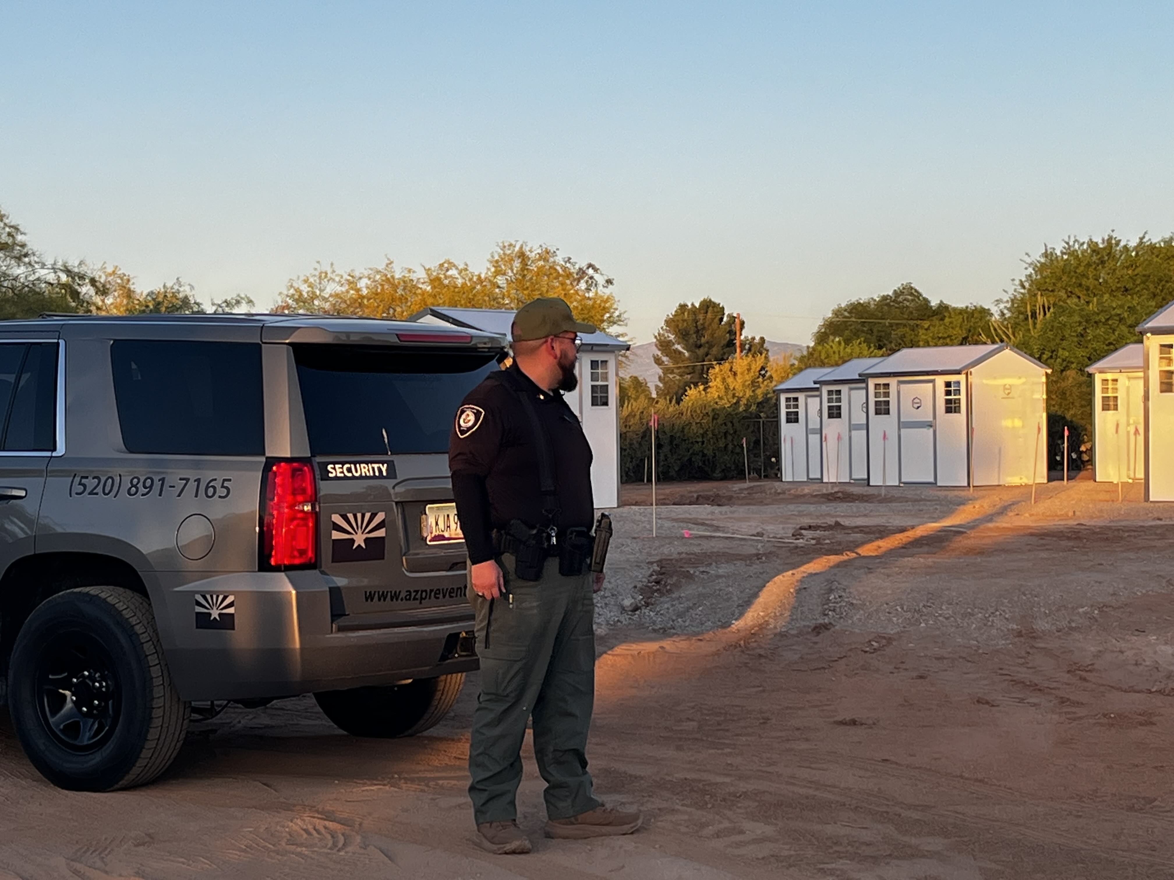 | | Security Service at THP Village Once the micro-shelters were set up on the site of our village, The Homing Project established security, through a contract with Arizona Preventive Crime Unit, to protect our organization's key on-site assets. Over the next couple of months, toilet and bathing facilities, a kitchen, a laundry, and residents will be coming to the site, all making security increasingly important. On May 1st, THP CEO Kris Olson-Garewal met with Sergeant Hinojosa at the village site, as he assumed nighttime security duties. | | | |