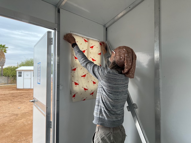 | | | | | | Kris with the Kol Ami Seventh Grade Class. Photo by Rina Liebeskind of the Synagogue Kol Ami Educational Program | | | | | | Sewing Curtains to make micro-shelters feel more like casitas... THP volunteers are working to provide the micro-shelters with curtains, making the interiors homier than their current, newly assembled, fresh off the pallet, factory finish appearance. Volunteers who like to sew are invited to come and help sew the curtains on May 21st. Interested volunteers can sign up for this opportunity on the THP website. The sewing is being accommodated in Cathey's Down the Block, a branch of Cathey's Sew and Vac, at 5851 E Speedway Blvd, Tucson, AZ 85712. A big Thank You to Cathy’s Sew and Vac for letting us use their space for sewing curtains!