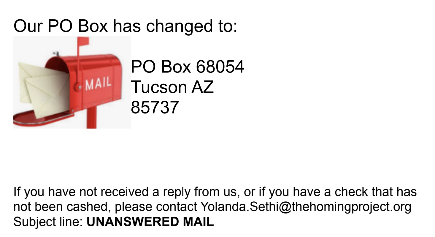 Thank you for choosing to serve our community with us, from the Board and Newsletter Staff of The Homing Project!